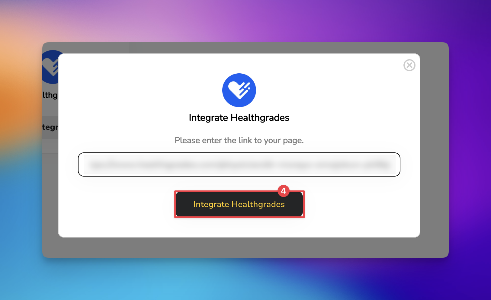 Select the 'Integrate' button next to HealthGrades. A window will appear asking for your specific HealthGrades Professional Profile URL.