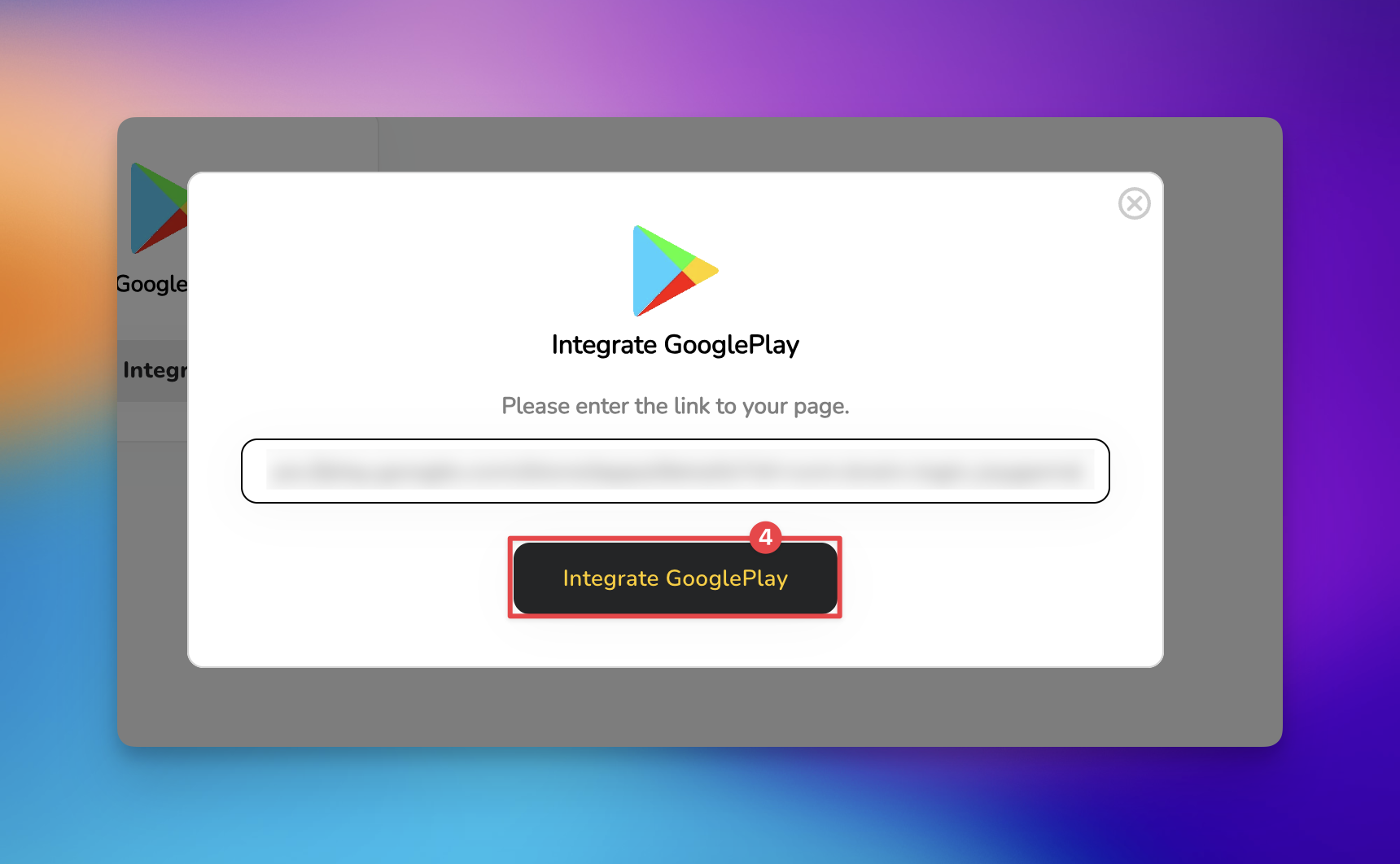 Select the 'Integrate' button and you will be prompted to provide your unique GooglePlay Store URL. Make sure you are using the public link to your app's listing, not your developer console link.