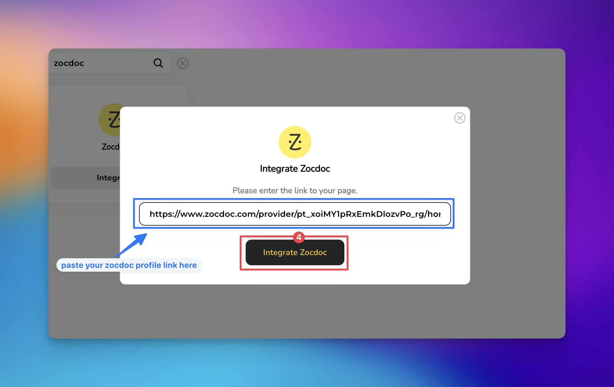 5. Enter Your Zocdoc Profile Link - Click the 'Integrate' button and a window will appear asking for your credentials. Copy and paste your public Zocdoc profile URL into the designated field.