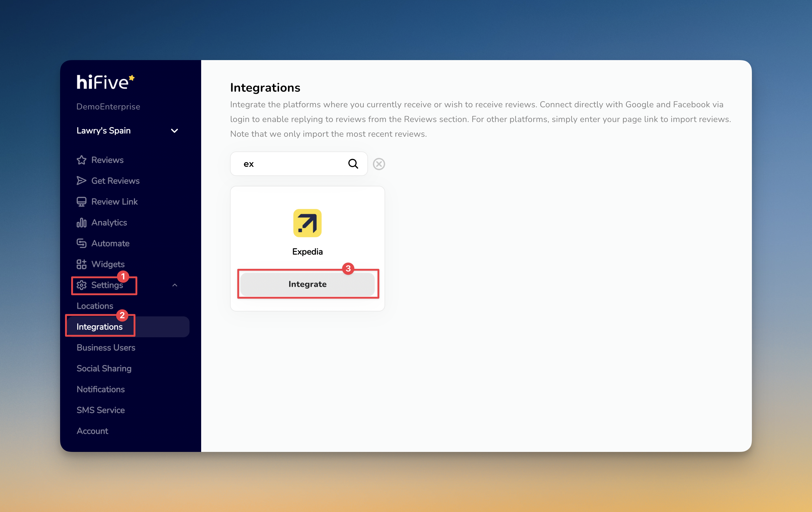 Click 'Integrate Expedia' button to verify the link. HiFiveStar will now begin synchronizing your Expedia reviews with your dashboard.