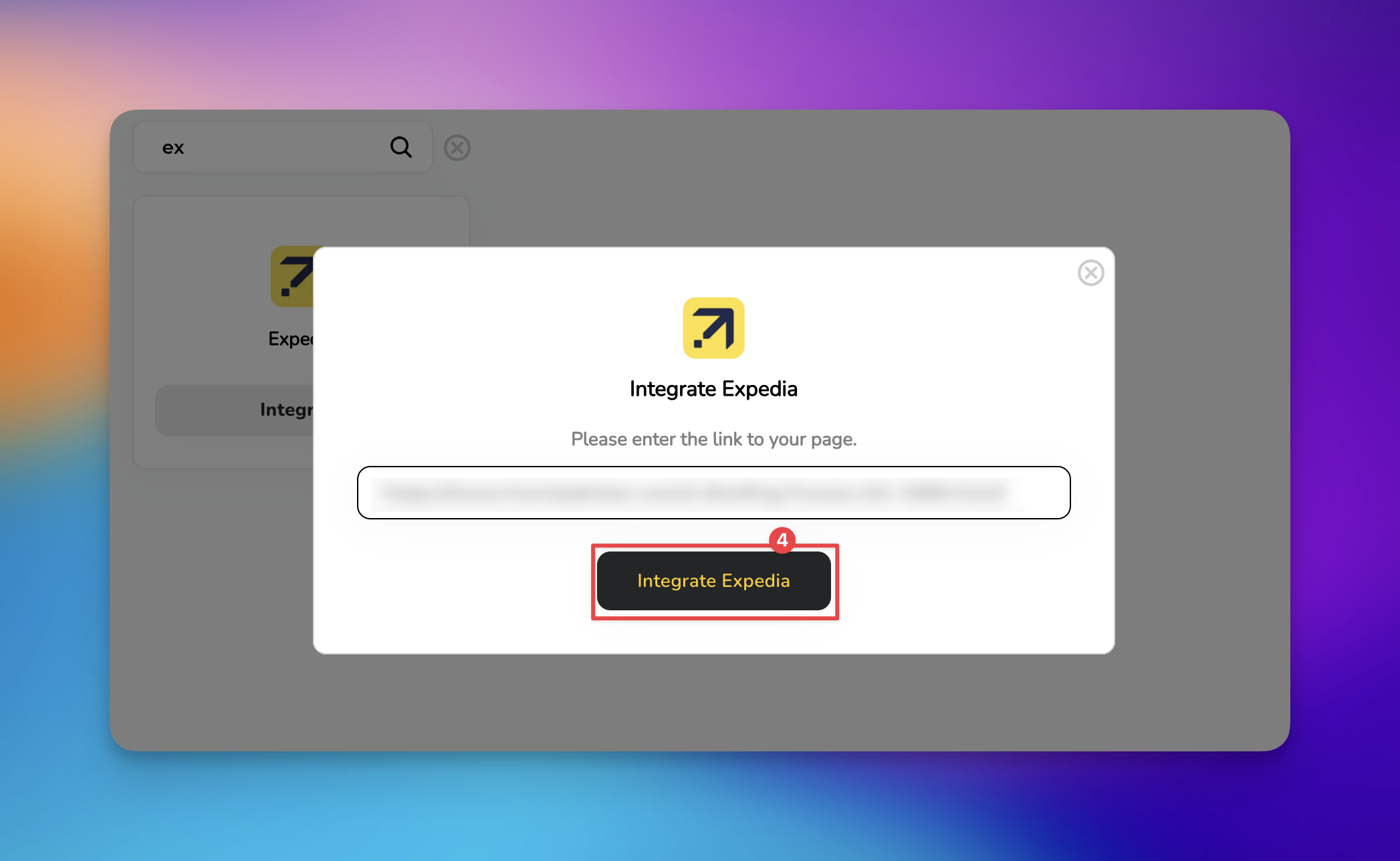 Click the Integrate button. A field will appear asking for your public business link. Copy your business profile URL directly from Expedia.com and paste it here.