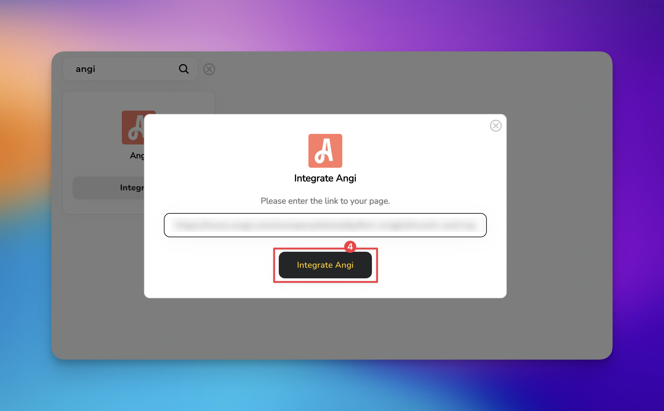 Use the search bar at the top of the page and type "Angi" to quickly filter the results. Once the Angi icon appears, click the ‘Integrate’ button.