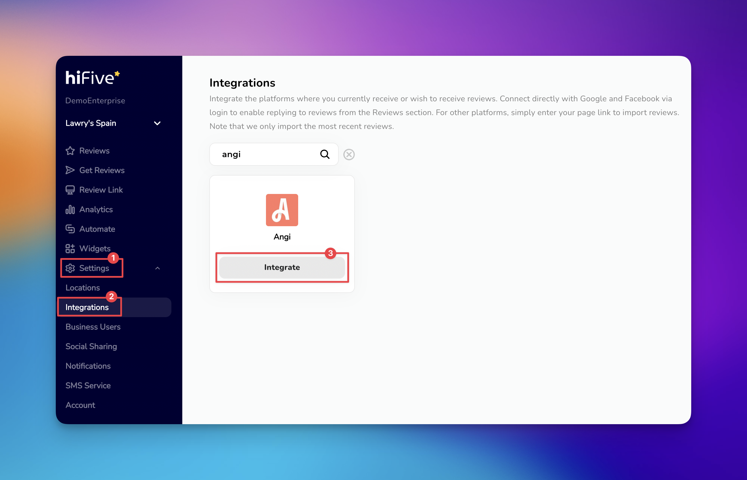 Click the ‘Integrate Angi’ button to confirm. Your recent reviews will begin syncing with your HiFiveStar dashboard shortly.