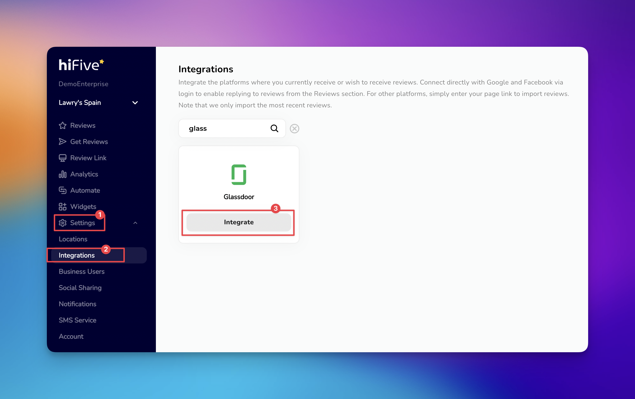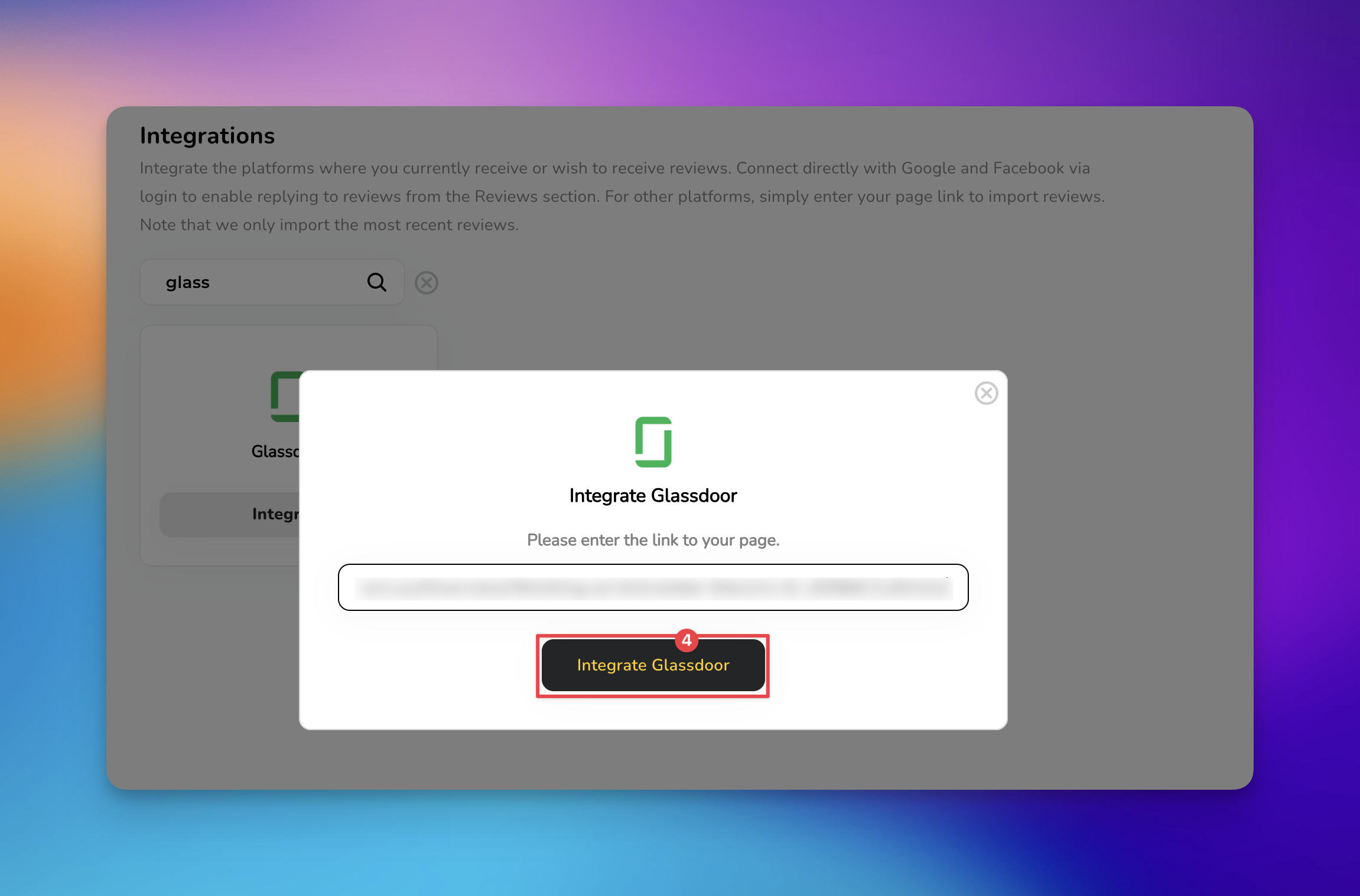 Visit Glassdoor to copy the web address of your official company profile. Paste this link into the provided field and click 'Integrate Glassdoor'.