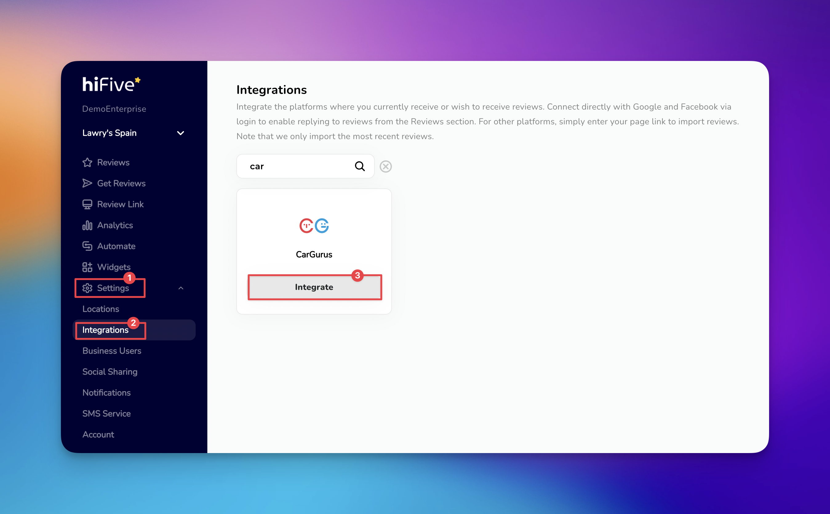 Locate the 'Integrations' tab under the Settings menu to display a directory of all third-party services currently supported for data syncing and review management.