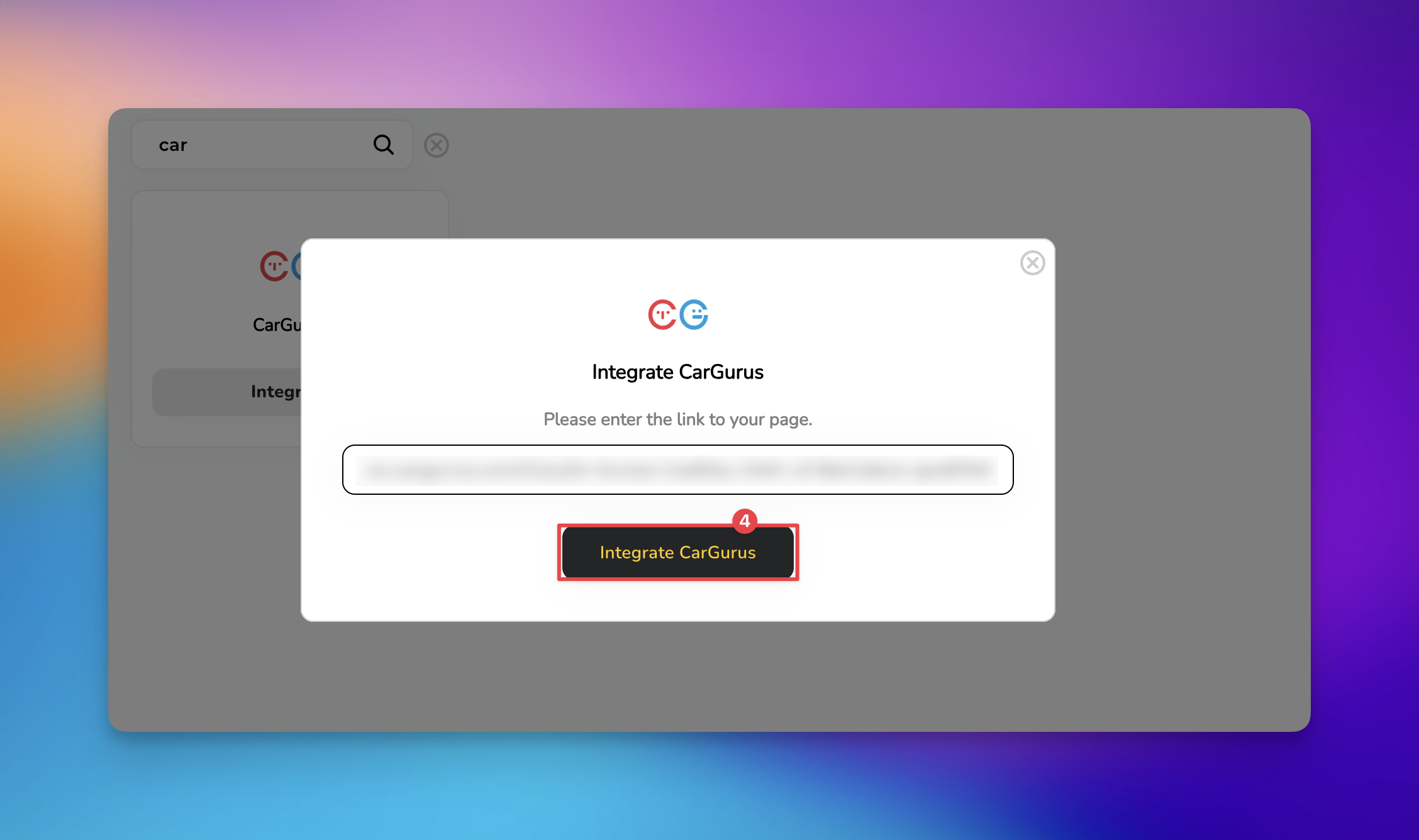 Paste your CarGurus URL into the empty field and select the 'Integrate CarGurus' button. The system will then verify the link and establish a live connection between the two platforms.