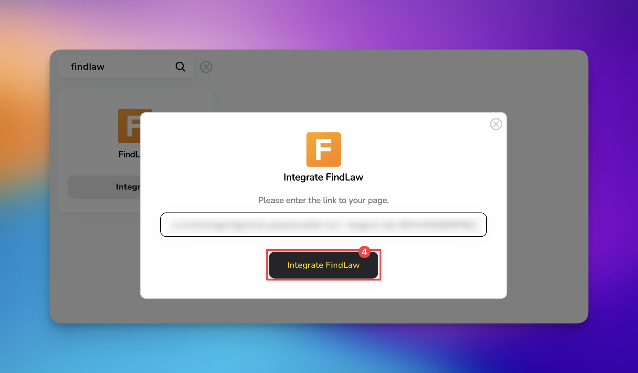 Paste your profile link into the empty field and select the final 'Integrate FindLaw' button. The system will verify the link and establish the sync.