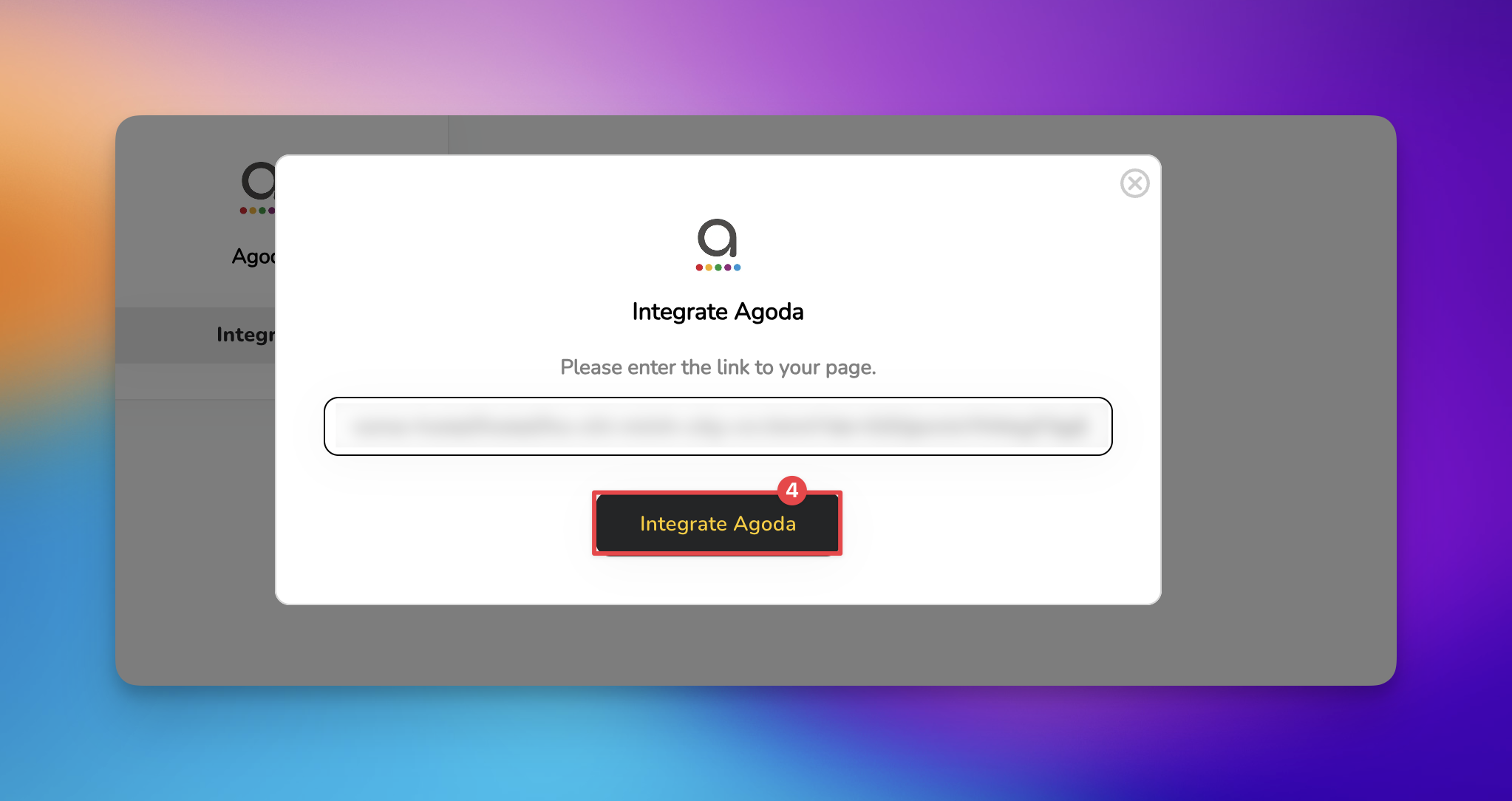 Choose the 'Integrate' button. When the prompt appears, enter your specific Agoda profile URL into the designated text box.